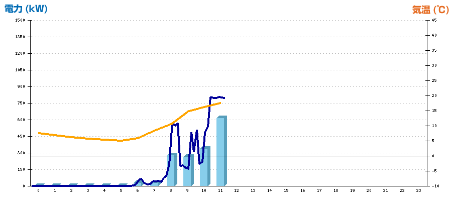 | 時刻 | 日射強度 (kW/㎡) | 気温 (℃) | 発電電力量 (kWh) | CO2削減量 (kg-CO2) | 売電金額(概算) (円) |