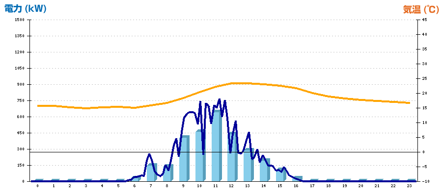 時刻 | 日射強度 (kW/㎡) | 気温 (℃) | 発電電力量 (kWh) | CO2削減量 (kg-CO2) | 売電金額(概算) (円) |