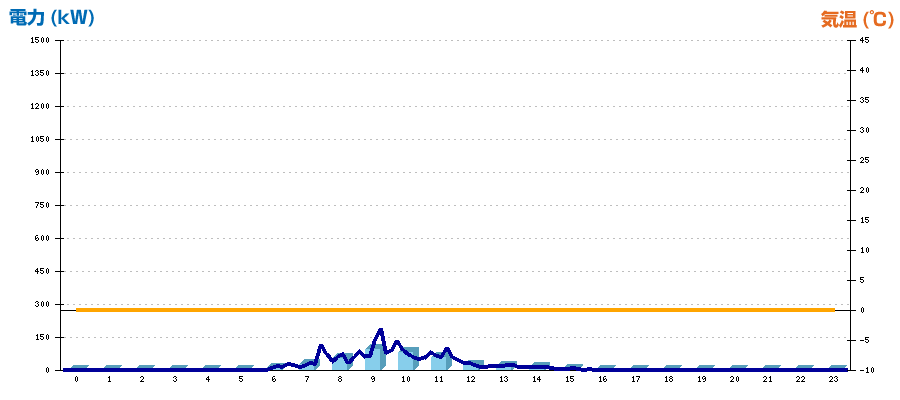 時刻 | 日射強度 (kW/㎡) | 気温 (℃) | 発電電力量 (kWh) | CO2削減量 (kg-CO2) | 売電金額(概算) (円) |