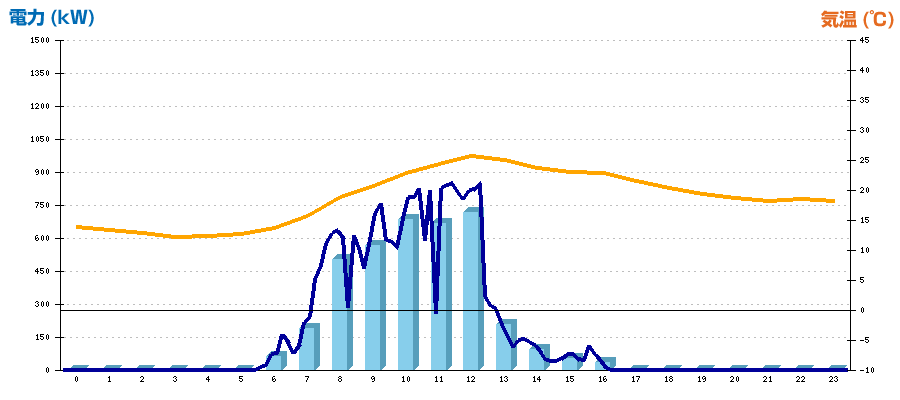 時刻 | 日射強度 (kW/㎡) | 気温 (℃) | 発電電力量 (kWh) | CO2削減量 (kg-CO2) | 売電金額(概算) (円) |