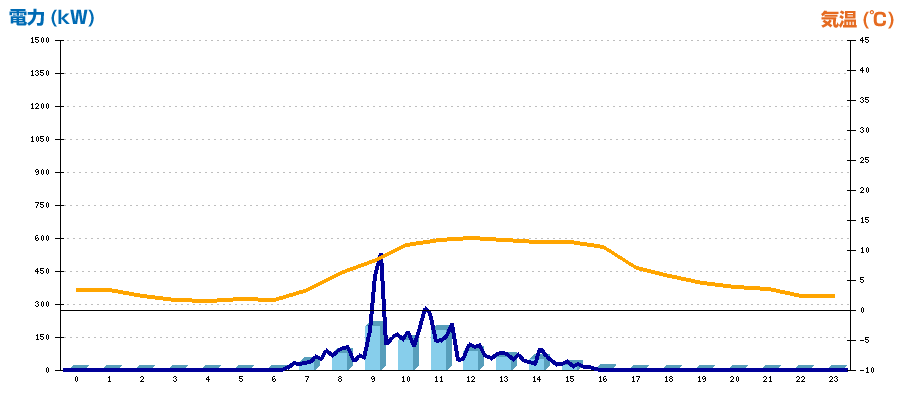 | 時刻 | 日射強度 (kW/㎡) | 気温 (℃) | 発電電力量 (kWh) | CO2削減量 (kg-CO2) | 売電金額(概算) (円) |