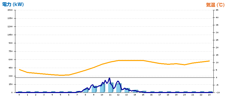 | 時刻 | 日射強度 (kW/㎡) | 気温 (℃) | 発電電力量 (kWh) | CO2削減量 (kg-CO2) | 売電金額(概算) (円) |
