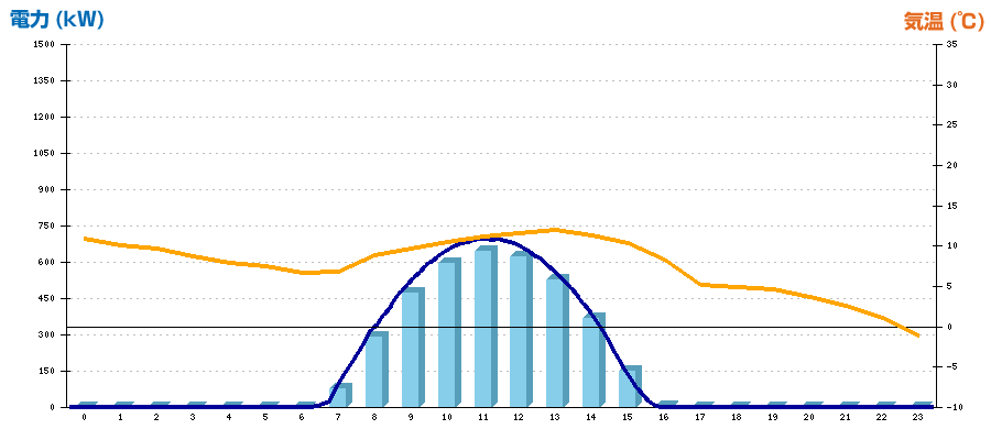 | 時刻 | 日射強度 (kW/㎡) | 気温 (℃) | 発電電力量 (kWh) | CO2削減量 (kg-CO2) | 売電金額(概算) (円) |
