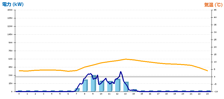 | 時刻 | 日射強度 (kW/㎡) | 気温 (℃) | 発電電力量 (kWh) | CO2削減量 (kg-CO2) | 売電金額(概算) (円) |