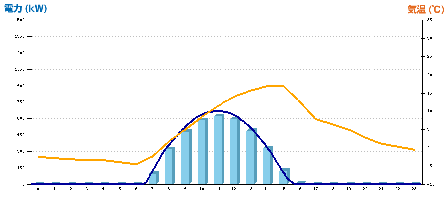 | 時刻 | 日射強度 (kW/㎡) | 気温 (℃) | 発電電力量 (kWh) | CO2削減量 (kg-CO2) | 売電金額(概算) (円) |