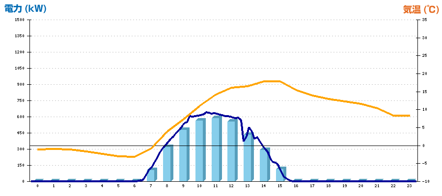 | 時刻 | 日射強度 (kW/㎡) | 気温 (℃) | 発電電力量 (kWh) | CO2削減量 (kg-CO2) | 売電金額(概算) (円) |
