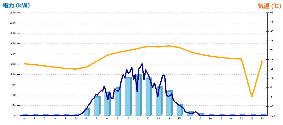 時刻 | 日射強度 (kW/㎡) | 気温 (℃) | 発電電力量 (kWh) | CO2削減量 (kg-CO2) | 売電金額(概算) (円) |