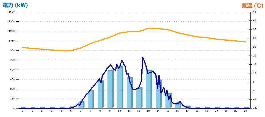 時刻 | 日射強度 (kW/㎡) | 気温 (℃) | 発電電力量 (kWh) | CO2削減量 (kg-CO2) | 売電金額(概算) (円) |