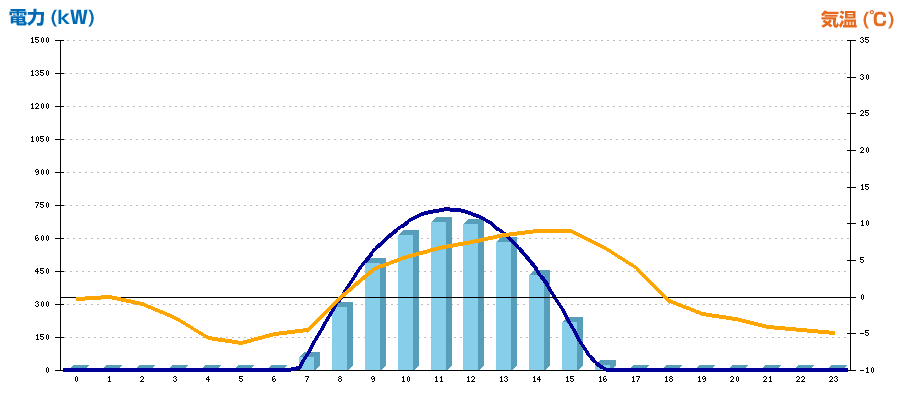 | 時刻 | 日射強度 (kW/㎡) | 気温 (℃) | 発電電力量 (kWh) | CO2削減量 (kg-CO2) | 売電金額(概算) (円) |