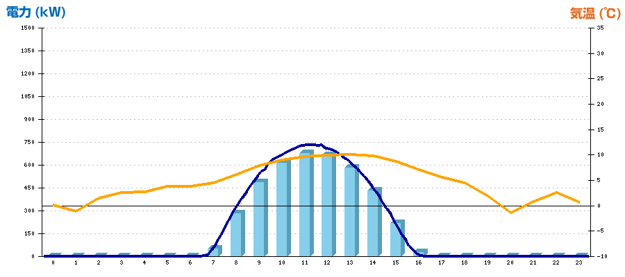 | 時刻 | 日射強度 (kW/㎡) | 気温 (℃) | 発電電力量 (kWh) | CO2削減量 (kg-CO2) | 売電金額(概算) (円) |