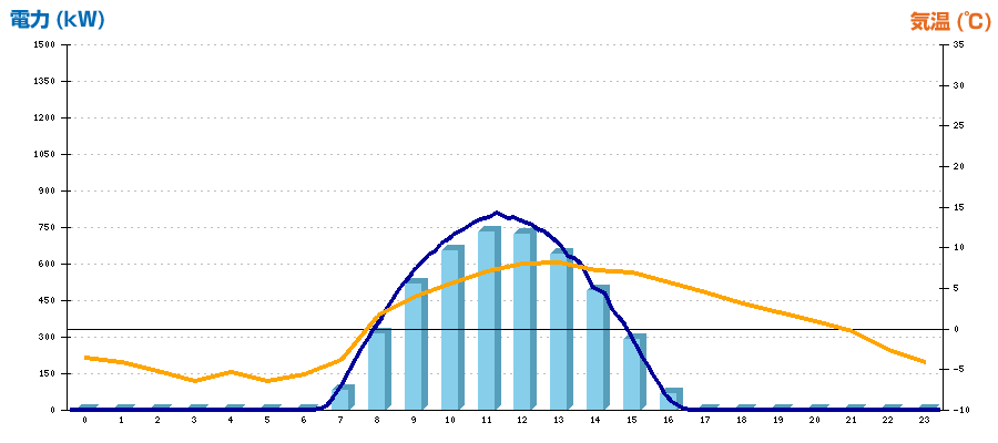 | 時刻 | 日射強度 (kW/㎡) | 気温 (℃) | 発電電力量 (kWh) | CO2削減量 (kg-CO2) | 売電金額(概算) (円) |