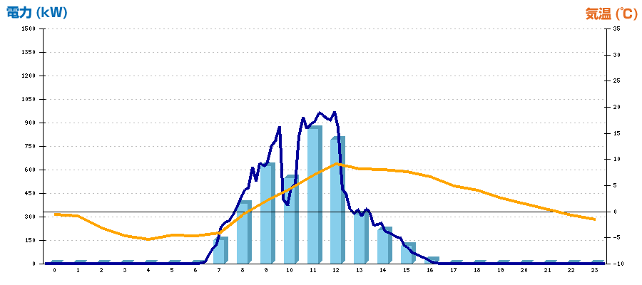 | 時刻 | 日射強度 (kW/㎡) | 気温 (℃) | 発電電力量 (kWh) | CO2削減量 (kg-CO2) | 売電金額(概算) (円) |