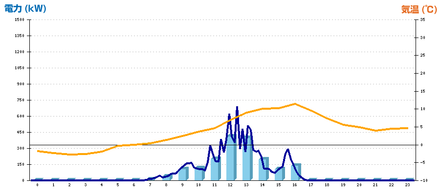 | 時刻 | 日射強度 (kW/㎡) | 気温 (℃) | 発電電力量 (kWh) | CO2削減量 (kg-CO2) | 売電金額(概算) (円) |