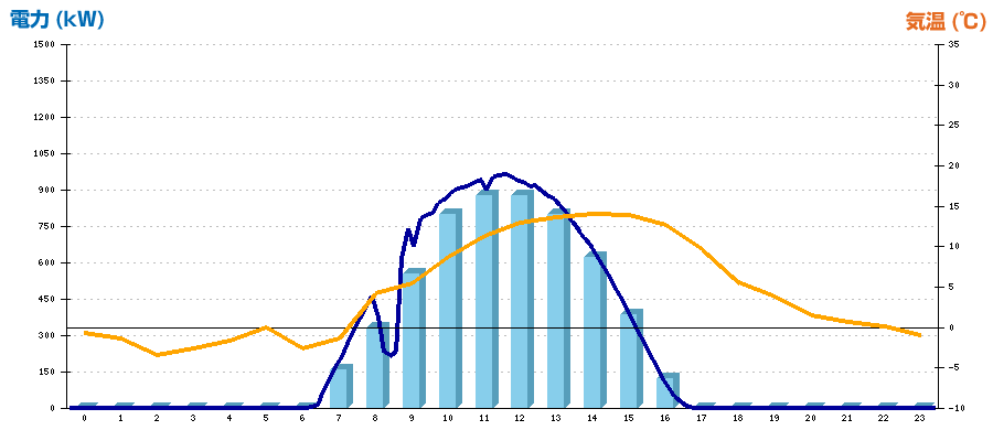 | 時刻 | 日射強度 (kW/㎡) | 気温 (℃) | 発電電力量 (kWh) | CO2削減量 (kg-CO2) | 売電金額(概算) (円) |
