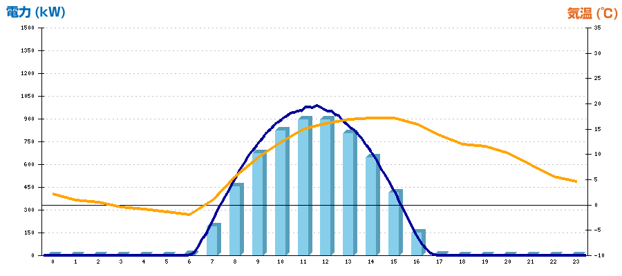 | 時刻 | 日射強度 (kW/㎡) | 気温 (℃) | 発電電力量 (kWh) | CO2削減量 (kg-CO2) | 売電金額(概算) (円) |