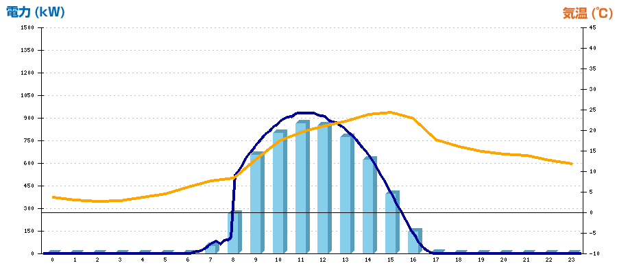 | 時刻 | 日射強度 (kW/㎡) | 気温 (℃) | 発電電力量 (kWh) | CO2削減量 (kg-CO2) | 売電金額(概算) (円) |