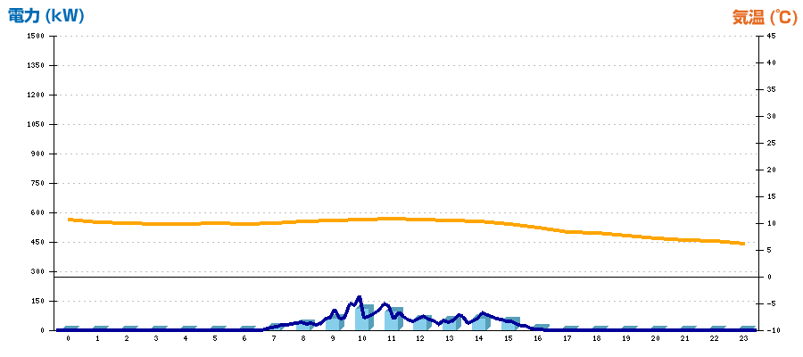 | 時刻 | 日射強度 (kW/㎡) | 気温 (℃) | 発電電力量 (kWh) | CO2削減量 (kg-CO2) | 売電金額(概算) (円) |