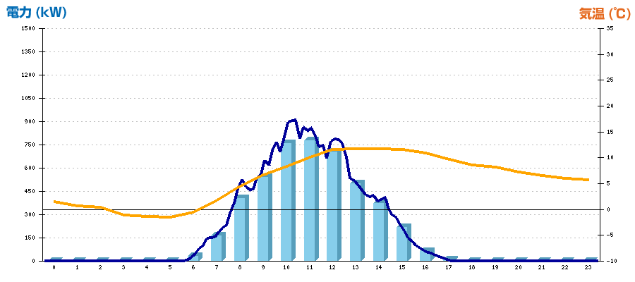 | 時刻 | 日射強度 (kW/㎡) | 気温 (℃) | 発電電力量 (kWh) | CO2削減量 (kg-CO2) | 売電金額(概算) (円) |