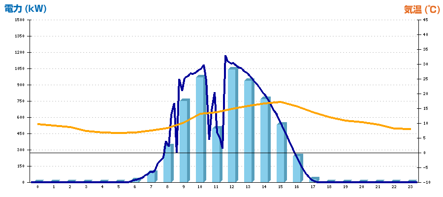 | 時刻 | 日射強度 (kW/㎡) | 気温 (℃) | 発電電力量 (kWh) | CO2削減量 (kg-CO2) | 売電金額(概算) (円) |