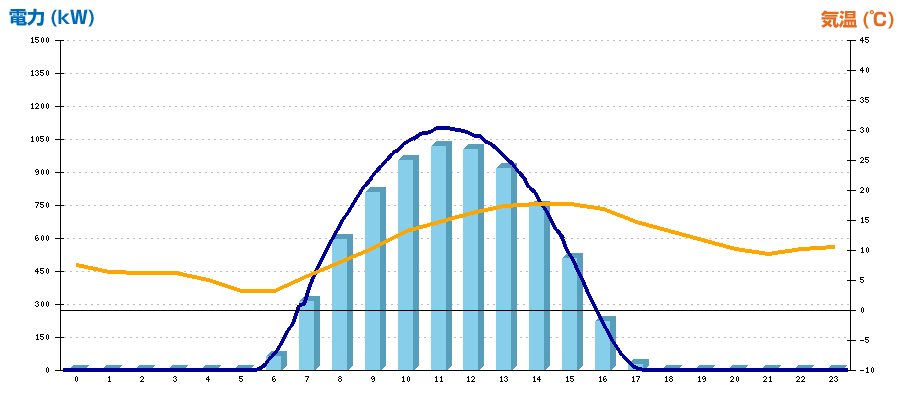 | 時刻 | 日射強度 (kW/㎡) | 気温 (℃) | 発電電力量 (kWh) | CO2削減量 (kg-CO2) | 売電金額(概算) (円) |