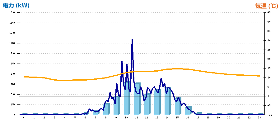 | 時刻 | 日射強度 (kW/㎡) | 気温 (℃) | 発電電力量 (kWh) | CO2削減量 (kg-CO2) | 売電金額(概算) (円) |