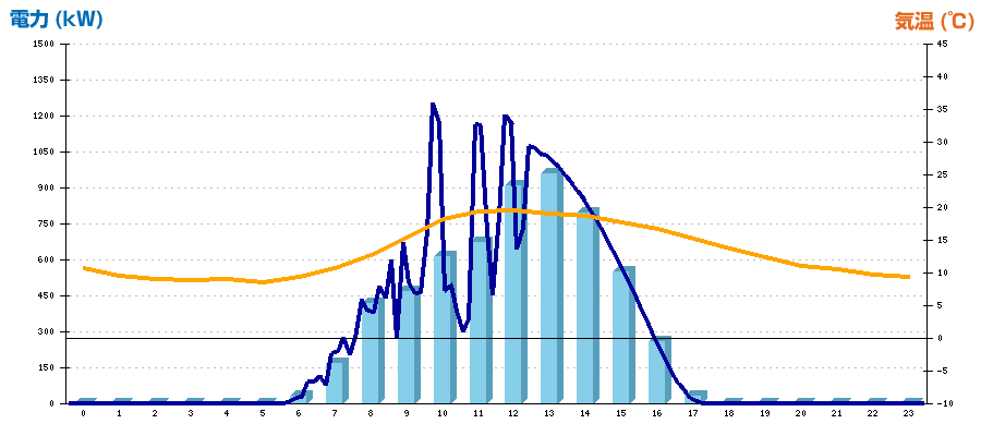 | 時刻 | 日射強度 (kW/㎡) | 気温 (℃) | 発電電力量 (kWh) | CO2削減量 (kg-CO2) | 売電金額(概算) (円) |