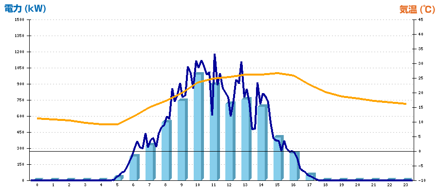 | 時刻 | 日射強度 (kW/㎡) | 気温 (℃) | 発電電力量 (kWh) | CO2削減量 (kg-CO2) | 売電金額(概算) (円) |