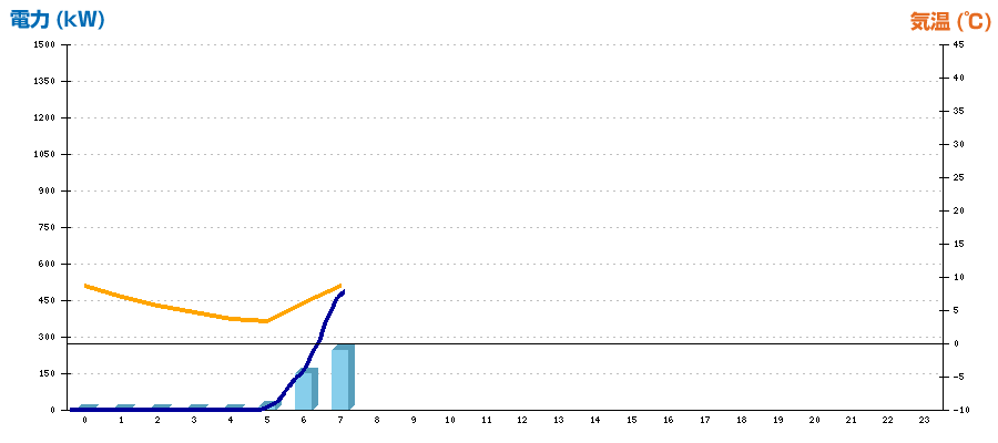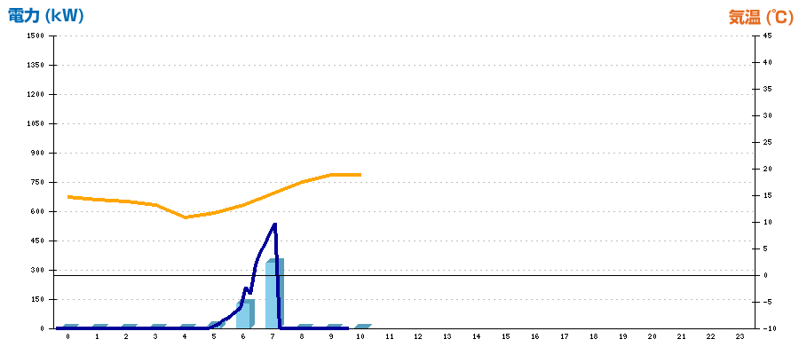 | 時刻 | 日射強度 (kW/㎡) | 気温 (℃) | 発電電力量 (kWh) | CO2削減量 (kg-CO2) | 売電金額(概算) (円) |