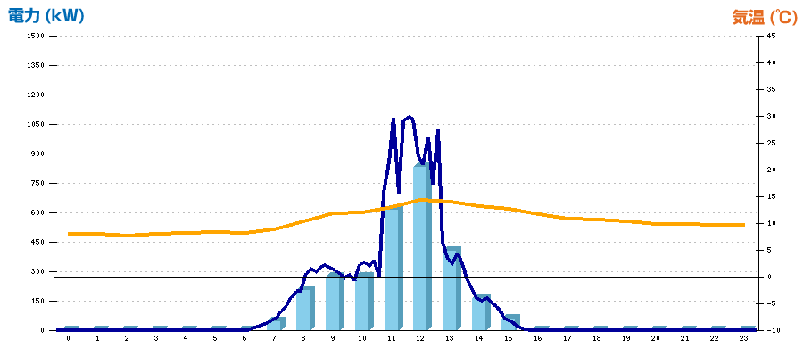 | 時刻 | 日射強度 (kW/㎡) | 気温 (℃) | 発電電力量 (kWh) | CO2削減量 (kg-CO2) | 売電金額(概算) (円) |