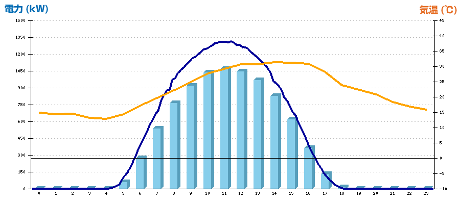 | 時刻 | 日射強度 (kW/㎡) | 気温 (℃) | 発電電力量 (kWh) | CO2削減量 (kg-CO2) | 売電金額(概算) (円) |