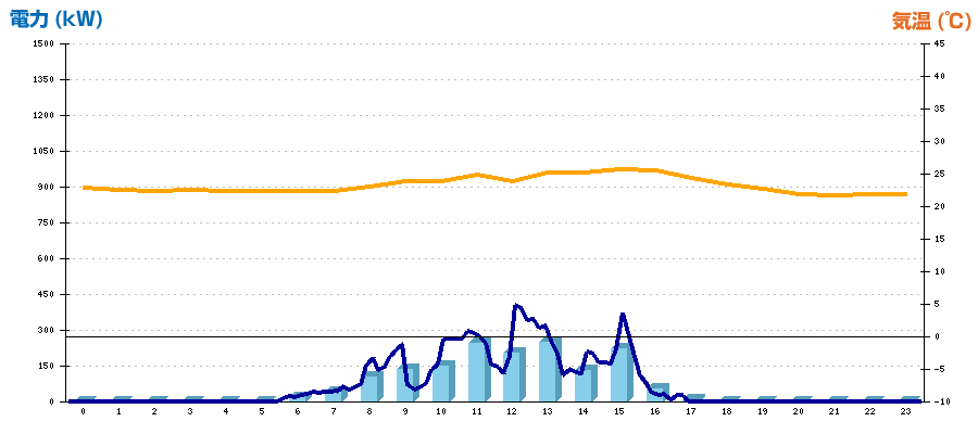 | 時刻 | 日射強度 (kW/㎡) | 気温 (℃) | 発電電力量 (kWh) | CO2削減量 (kg-CO2) | 売電金額(概算) (円) |