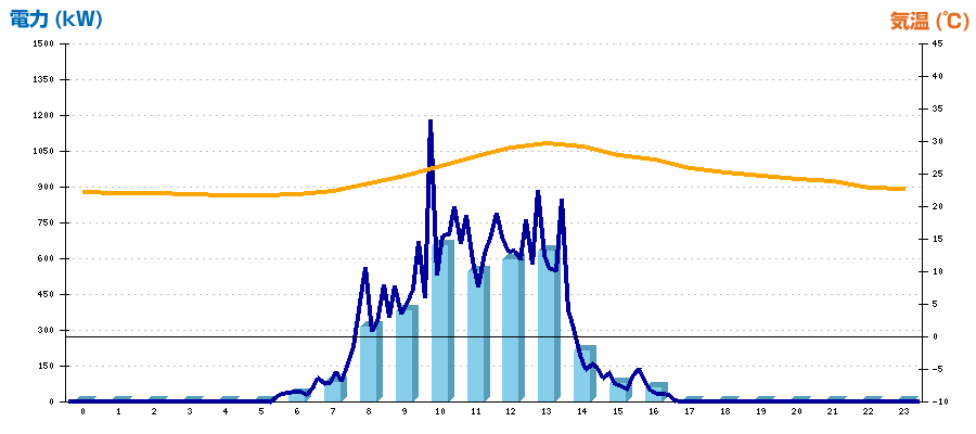 | 時刻 | 日射強度 (kW/㎡) | 気温 (℃) | 発電電力量 (kWh) | CO2削減量 (kg-CO2) | 売電金額(概算) (円) |