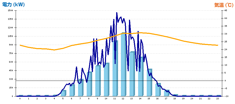 | 時刻 | 日射強度 (kW/㎡) | 気温 (℃) | 発電電力量 (kWh) | CO2削減量 (kg-CO2) | 売電金額(概算) (円) |