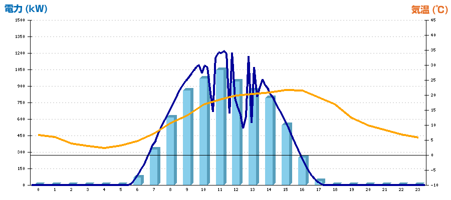 | 時刻 | 日射強度 (kW/㎡) | 気温 (℃) | 発電電力量 (kWh) | CO2削減量 (kg-CO2) | 売電金額(概算) (円) |