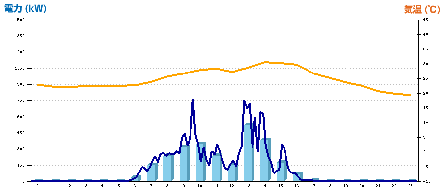 | 時刻 | 日射強度 (kW/㎡) | 気温 (℃) | 発電電力量 (kWh) | CO2削減量 (kg-CO2) | 売電金額(概算) (円) |