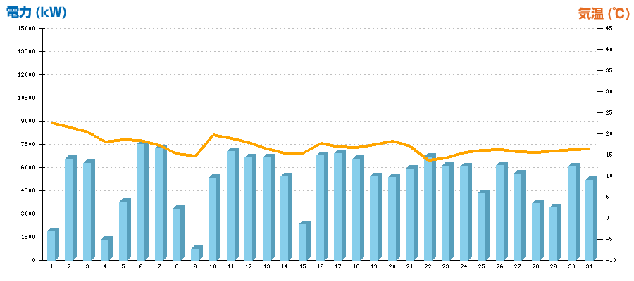 | 日付 | 日射強度 (kW/㎡) | 気温 (℃) | 発電電力量 (kWh) | CO2削減量 (kg-CO2) | 売電金額(概算) (円) |