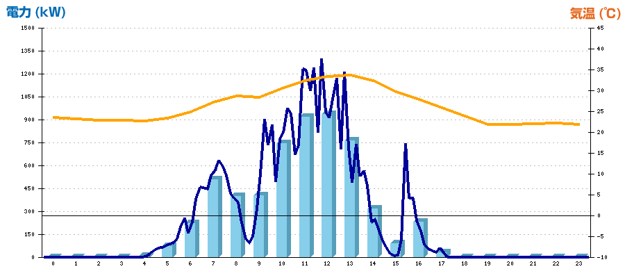 | 時刻 | 日射強度 (kW/㎡) | 気温 (℃) | 発電電力量 (kWh) | CO2削減量 (kg-CO2) | 売電金額(概算) (円) |