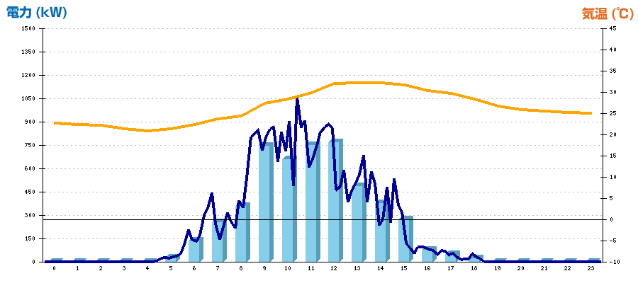 | 時刻 | 日射強度 (kW/㎡) | 気温 (℃) | 発電電力量 (kWh) | CO2削減量 (kg-CO2) | 売電金額(概算) (円) |