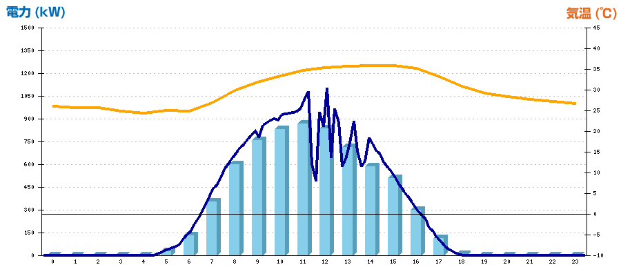 | 時刻 | 日射強度 (kW/㎡) | 気温 (℃) | 発電電力量 (kWh) | CO2削減量 (kg-CO2) | 売電金額(概算) (円) |