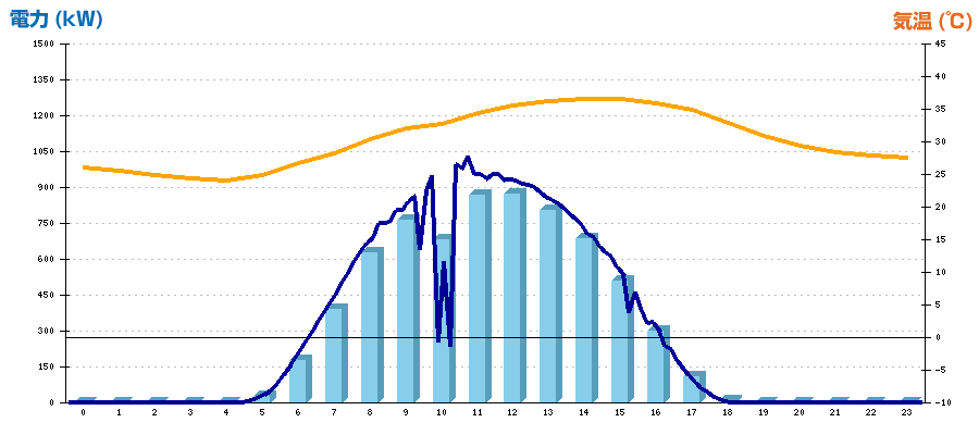 | 時刻 | 日射強度 (kW/㎡) | 気温 (℃) | 発電電力量 (kWh) | CO2削減量 (kg-CO2) | 売電金額(概算) (円) |