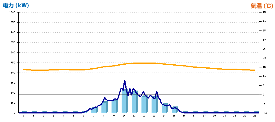 時刻 | 日射強度 (kW/㎡) | 気温 (℃) | 発電電力量 (kWh) | CO2削減量 (kg-CO2) | 売電金額(概算) (円) |