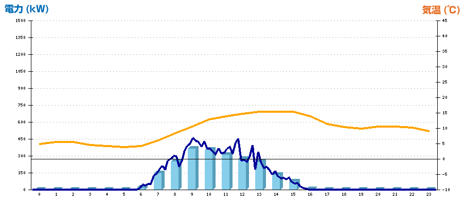 | 時刻 | 日射強度 (kW/㎡) | 気温 (℃) | 発電電力量 (kWh) | CO2削減量 (kg-CO2) | 売電金額(概算) (円) |