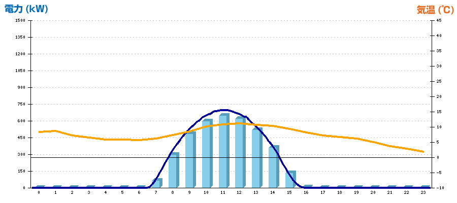 | 時刻 | 日射強度 (kW/㎡) | 気温 (℃) | 発電電力量 (kWh) | CO2削減量 (kg-CO2) | 売電金額(概算) (円) |