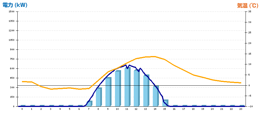 | 時刻 | 日射強度 (kW/㎡) | 気温 (℃) | 発電電力量 (kWh) | CO2削減量 (kg-CO2) | 売電金額(概算) (円) |