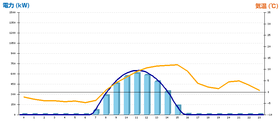 | 時刻 | 日射強度 (kW/㎡) | 気温 (℃) | 発電電力量 (kWh) | CO2削減量 (kg-CO2) | 売電金額(概算) (円) |