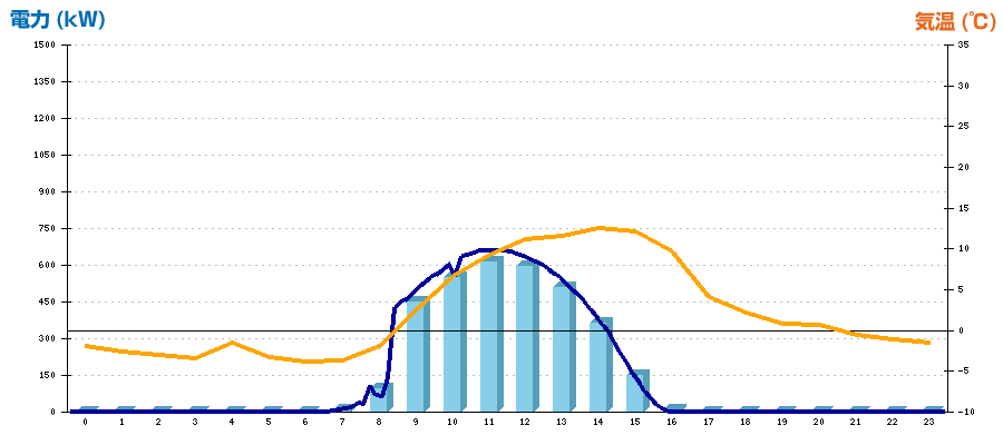 | 時刻 | 日射強度 (kW/㎡) | 気温 (℃) | 発電電力量 (kWh) | CO2削減量 (kg-CO2) | 売電金額(概算) (円) |