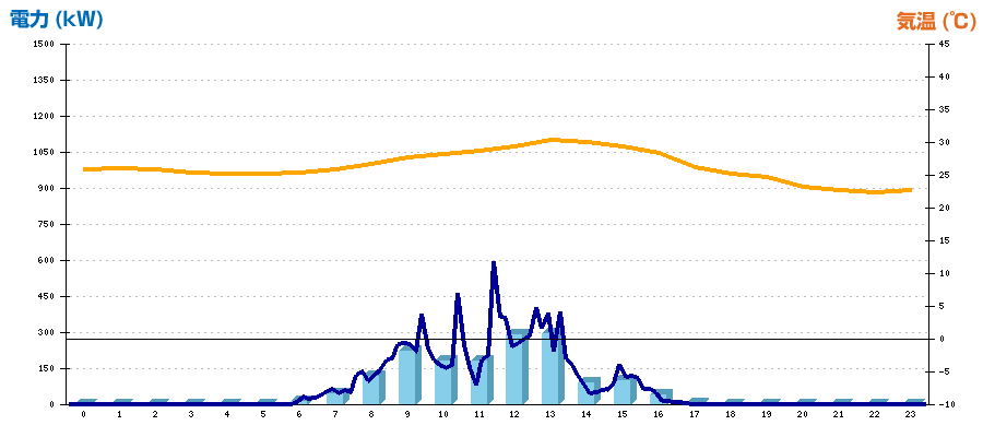 時刻 | 日射強度 (kW/㎡) | 気温 (℃) | 発電電力量 (kWh) | CO2削減量 (kg-CO2) | 売電金額(概算) (円) |