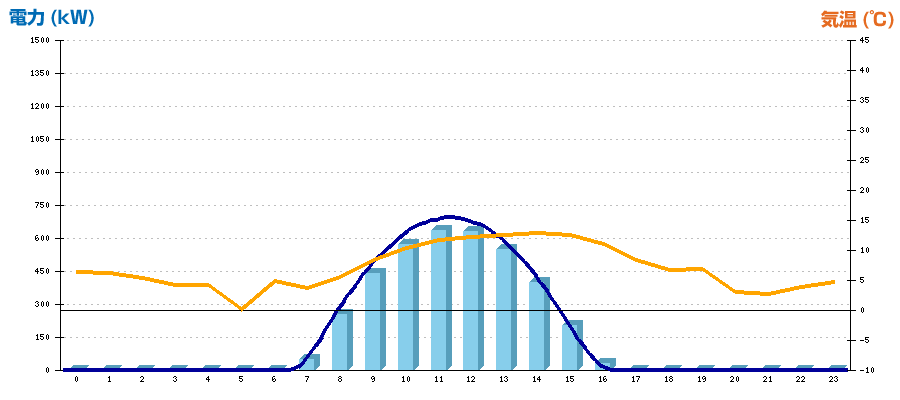| 時刻 | 日射強度 (kW/㎡) | 気温 (℃) | 発電電力量 (kWh) | CO2削減量 (kg-CO2) | 売電金額(概算) (円) |