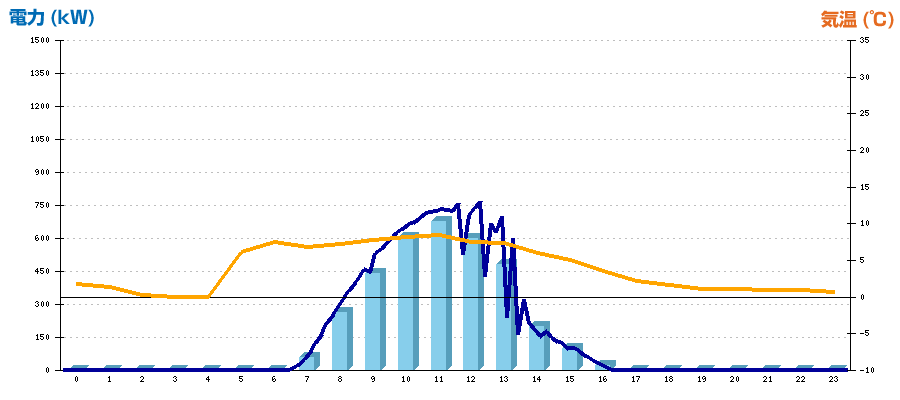 | 時刻 | 日射強度 (kW/㎡) | 気温 (℃) | 発電電力量 (kWh) | CO2削減量 (kg-CO2) | 売電金額(概算) (円) |