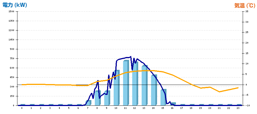 | 時刻 | 日射強度 (kW/㎡) | 気温 (℃) | 発電電力量 (kWh) | CO2削減量 (kg-CO2) | 売電金額(概算) (円) |